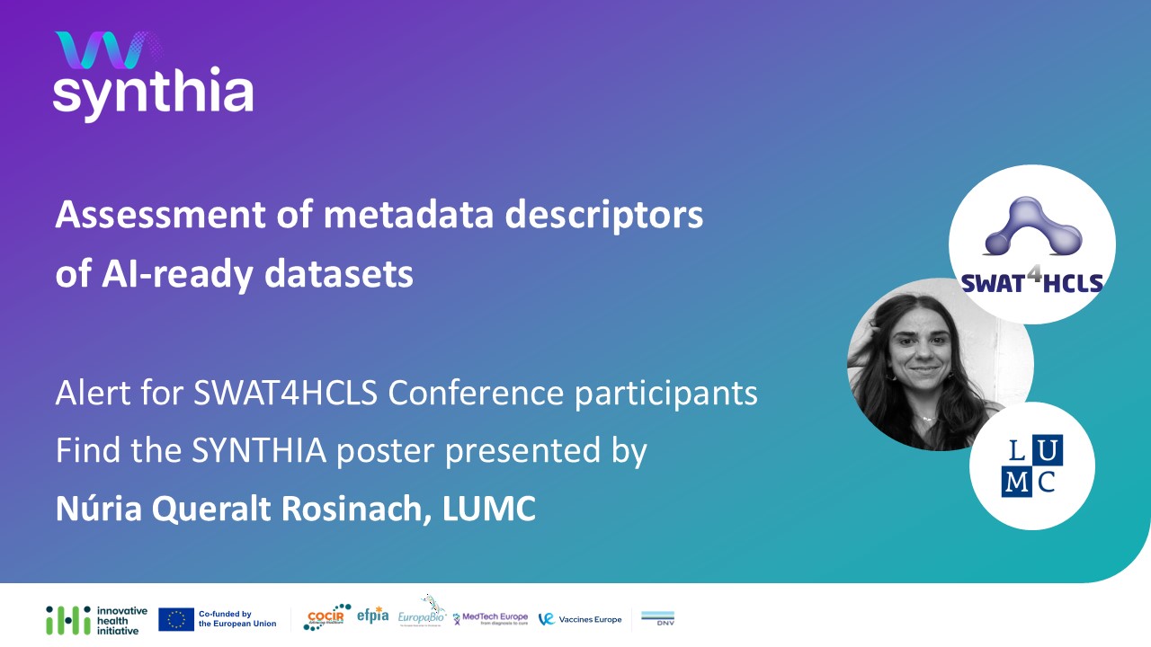 SYNTHIA Partner, Núria Queralt Rosinach from Leiden University Medical Center (LUMC), will showcase the accepted SYNHTIA abstract as a poster, titled: Assessment of metadata descriptors of AI-ready datasets.
